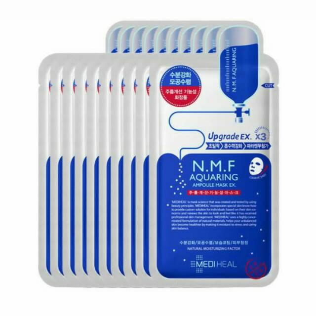 N.M.F Aquaring Ampoule Mask yang berfungsi untuk mengatasi kulit dehidrasi, kulit sensitif, serta lingkaran hitam pada mata. I.P.I Lightmax Ampoule Mask mengandung I.P.L (Intense Perfect Light) Whitelux untuk membantu mengontrol produksi melanin sekaligus mencerahkan kulit. Tea Tree Healing Solution Essential Mask yang ditujukan untuk kulit sensitif, iritasi, berminyak, berjerawat, dan masih banyak lagi. Dengan banyaknya pilihan varian dengan fungsi spesifik, mengatasi permasalahan kulit dengan sheet mask pun menjadi lebih mudah. Cara Penggunaan: • Pakai toner setelah mencuci wajah, kemudian pakai mask sheet mulai dari dahi, lalu ke hidung dan pipi kiri. • Tarik Bagian lifting ke atas, kemudian rekatkan pada bagian pipi. • Diamkan masker selama 10 – 20 menit, kemudian lepaskan. • Tepuk-tepuk ringan untuk membantu penyerapan. BPOM: NA26180200171 Shelf life: 24 Months