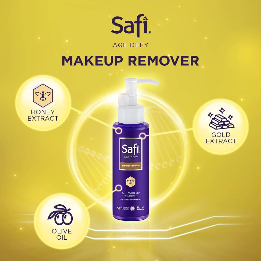 Safi Age Defy Make Up Remover adalah pembersih wajah yang mengandung Gold Extract, Olive Oil dan Honey Extract yang dapat membersihkan riasan wajah serta kotoran dengan mudah dan seksama, membantu menjaga kelembapan dan memelihara elastisitas kulit, Teknologi formulasi minyak yang dapat dibilas dengan air tanpa perlu menggunakan sabun. BPOM NA32181212477. Shelf life 3 tahun
